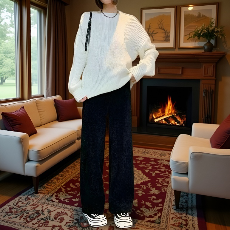 秋と冬の女性用のクリーム色のワイドレッグパンツに、ベルベットと厚みのあるハイウエストのルーズパンツで着痩せ効果があり、汎用性の高いドレープ性のカジュアルストレートパンツです。
